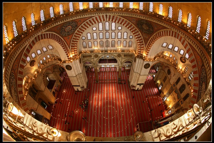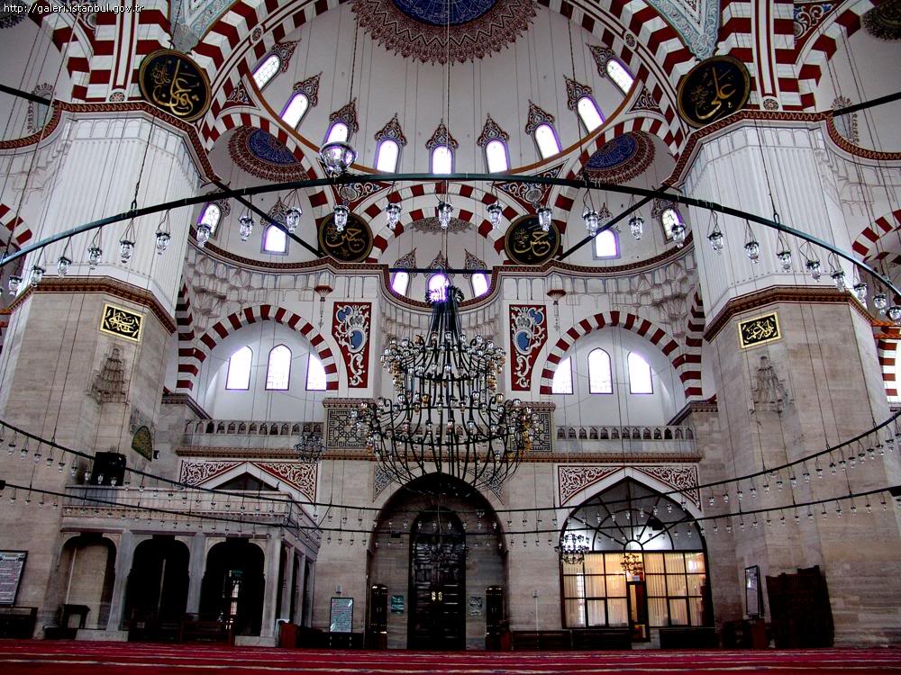 A l’intérieur, des arcs avec une alternance de couleurs rouges et blanches n’étaient pas sans rappeler l’architecture de l’Espagne musulmane, qui à ce moment-là n’était plus qu’un souvenir. Un lustre géant était accroché au centre de la mosquée, juste au-dessus des têtes des fidèles. Dans un souci d’écologie et de conservation, Sinan installa des fenêtres spéciales dans la mosquée : elles avaient sur elles un écran qui piégeait la suie qui s’échappait des bougies qui éclairaient la mosquée. Ainsi, la suie n’encrassait pas l’air extérieur, et pouvait même être transformée en encre pour être utilisée par les calligraphes.